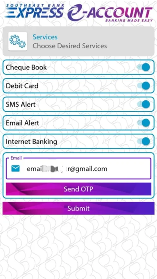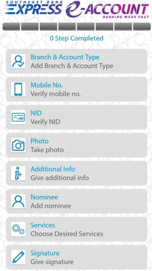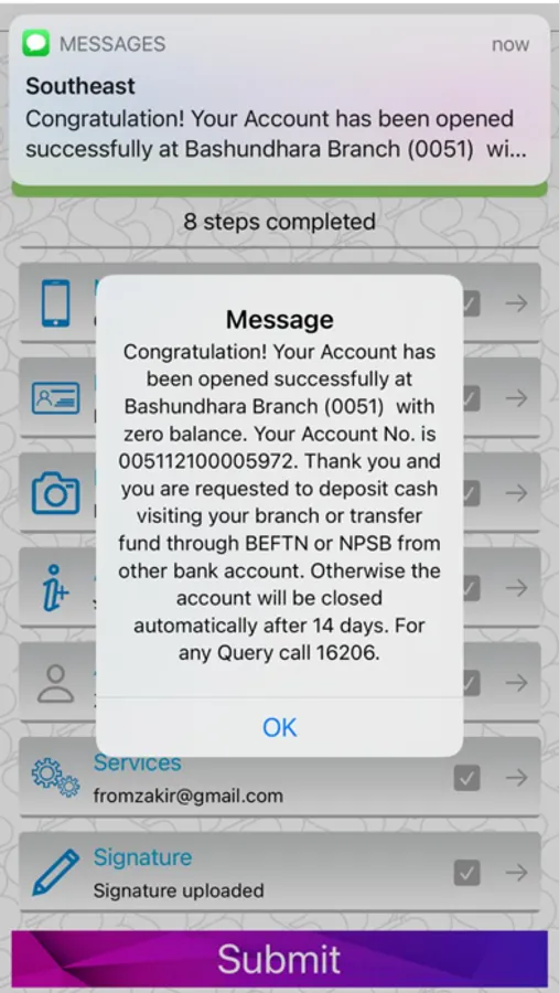 7. Initial deposit to new account either from any Branch or Uposhakha of Southeast Bank or from other bank account using BEFTN/NPSB.