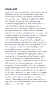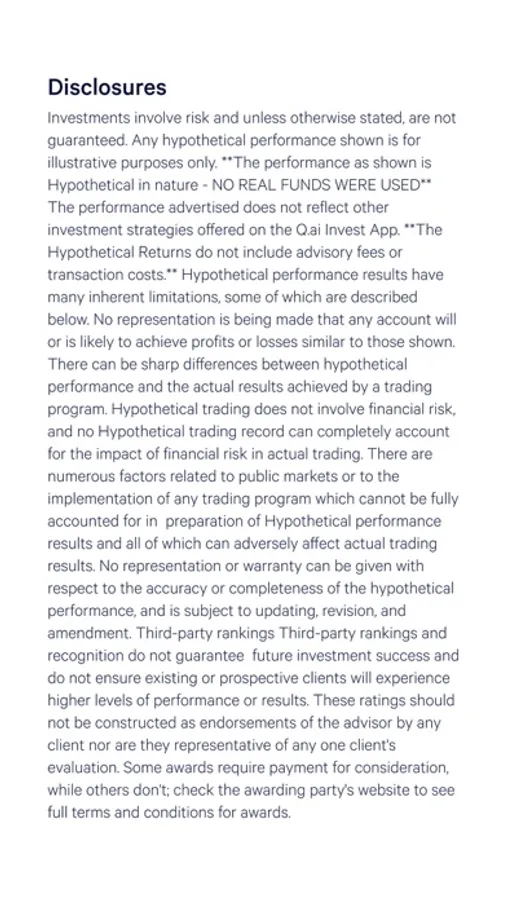 Investments involve risk and, unless otherwise stated, are not guaranteed. Any hypothetical performance shown is for illustrative purposes only. **The performance as shown is Hypothetical in nature - NO REAL FUNDS WERE USED** The performance advertised does not reflect other investment strategies offered on the Q.ai Invest App. **The Hypothetical Returns do not include advisory fees or transaction costs.** Hypothetical performance results have many inherent limitations, some of which are described below. No representation is being made that any account will or is likely to achieve profits or losses similar to those shown. There can be sharp differences between hypothetical performance and the actual results achieved by a trading program. Hypothetical trading does not involve financial risk, and no Hypothetical trading record can completely account for the impact of financial risk in actual trading. Numerous factors are related to public markets or the implementation of any trading program that cannot be fully accounted for in the preparation of Hypothetical performance results and can adversely affect actual trading results. No representation or warranty can be given with respect to the accuracy or completeness of the hypothetical performance and is subject to updating, revision, and amendment. Third-party rankings and recognition do not guarantee future investment success and do not ensure existing or prospective clients will experience higher levels of performance or results. These ratings should not be constructed as endorsements of the advisor by any client, nor are they representative of any client's evaluation. Some awards require payment for consideration, while others don't; check the awarding party's website to see full terms and conditions for awards.