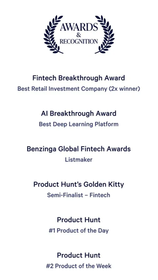 - FinTech Breakthrough Award for Best Retail Investment Platform