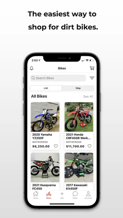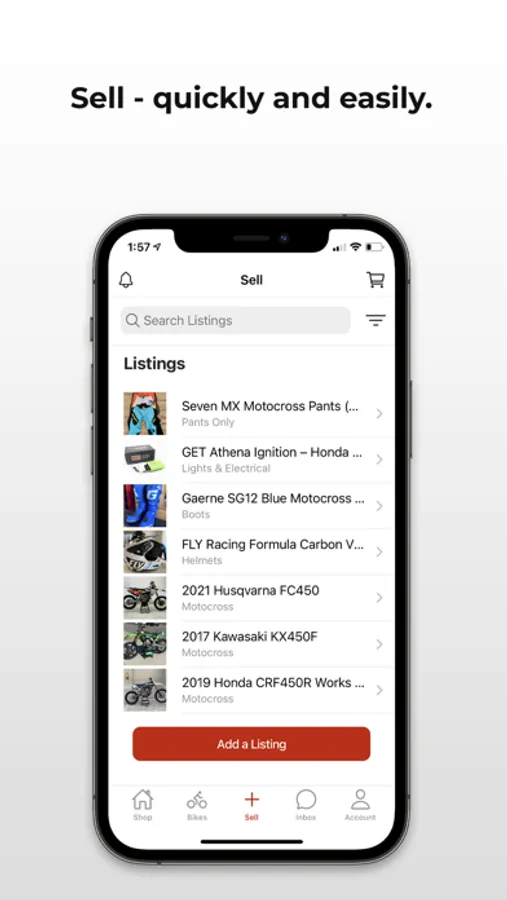 Sell in minutes – snap a photo, set a price, and print a shipping label when the item sells. Cash in on your riding gear or bike parts. List your bike directly for sale on the MX Locker app and reach thousands of members in the dirt bike community.
