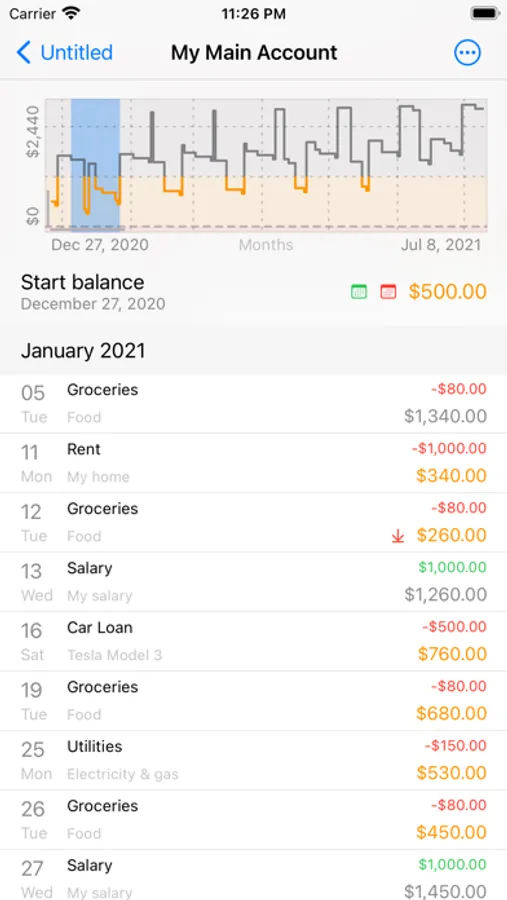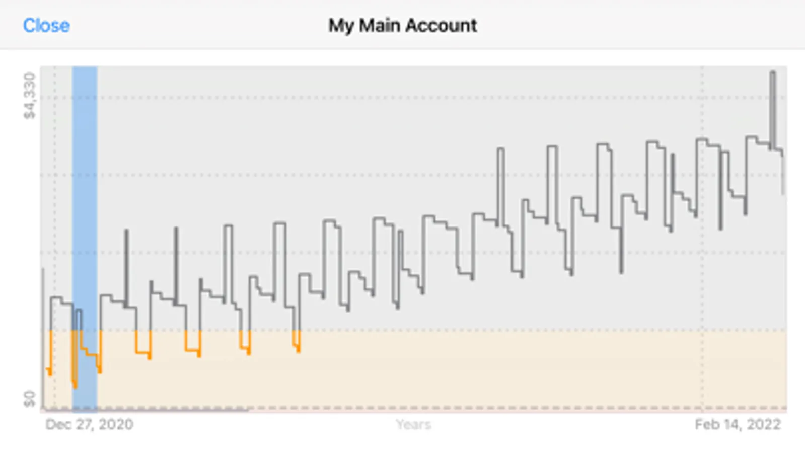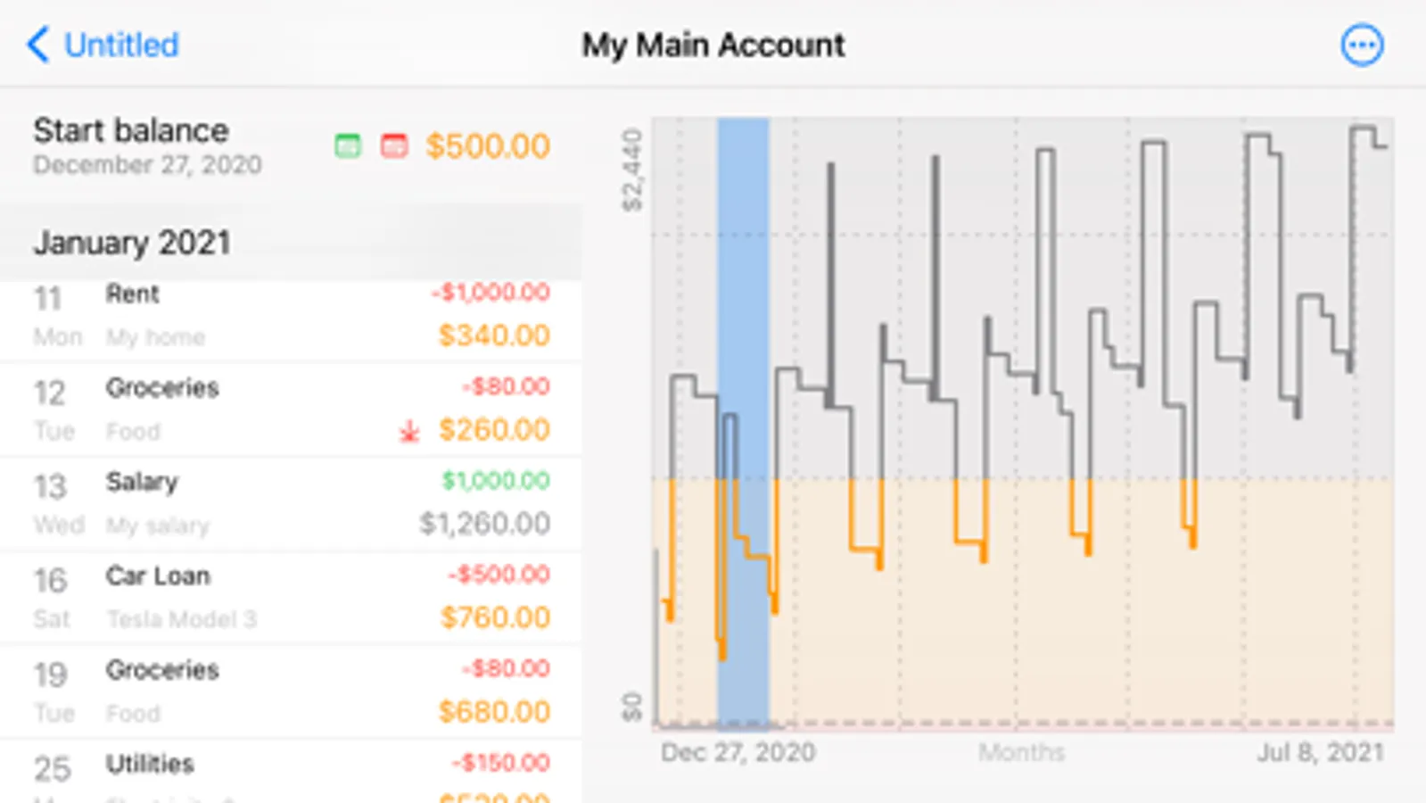 - Interactive forecast graph: Shows your future balance over time, highlighting warning balance and negative regions; tap the graph for a closer look at the nearby transactions.