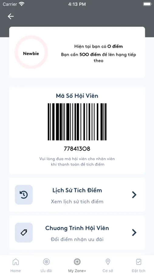 Mã số hội viên và lịch sử tích điểm sẽ hiển thị tại đây. Chỉ cần đưa nhân viên mã số của bạn sau mỗi lần sử dụng dịch vụ tại Zone+, bạn đã được tích ngay điểm thưởng tương ứng với hóa đơn và có thể dùng để đổi quà sau này.