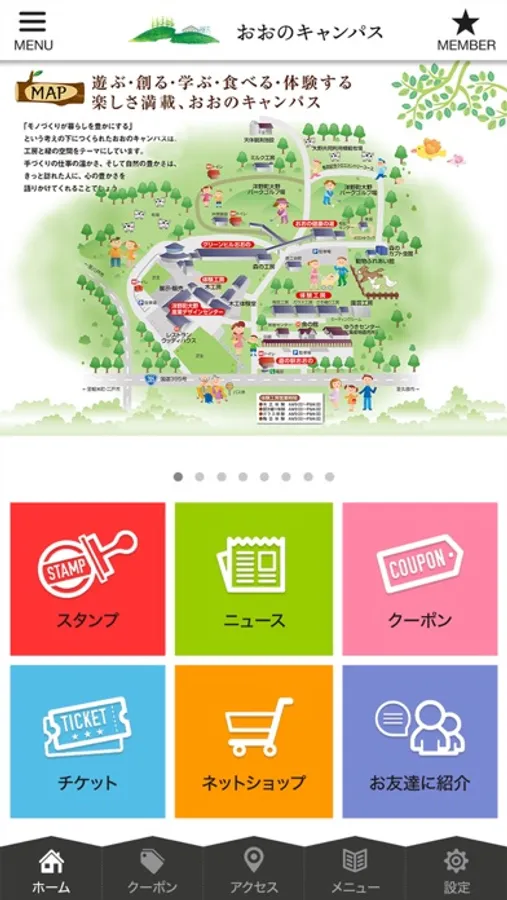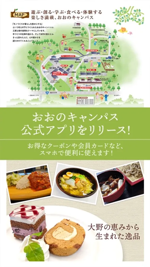 「道の駅おおの」に隣接した、18もの施設が融合したレジャースポット:おおのキャンパスの公式アプリです。