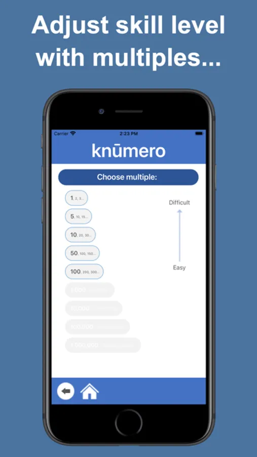 Multiples are the perfect way to adjust skill level. For any number range in knūmero, you can practice easier numbers (10,000… 11,000) or more difficult numbers (10,150… 11,745).