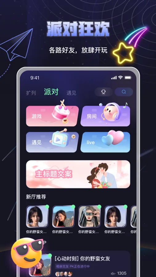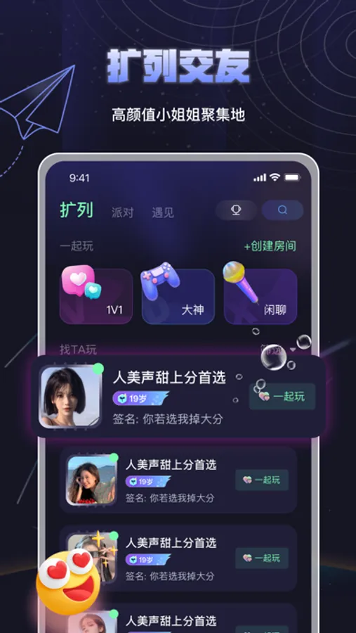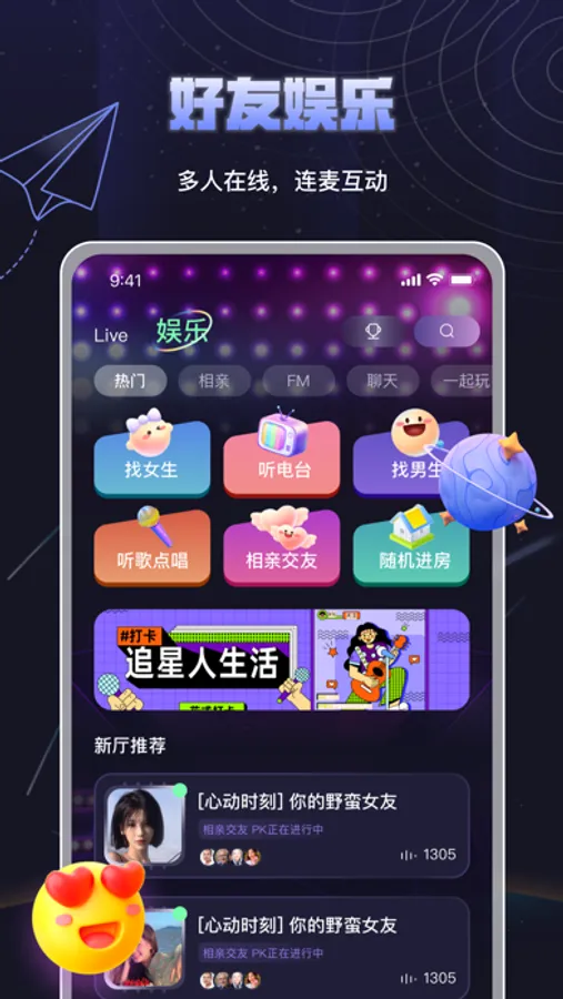 电台、K歌、相亲、Pia戏,聊天室玩法多多!在这里你会遇到声音动听有才艺的小哥哥、小姐姐,用声音交朋友,从此不孤单。