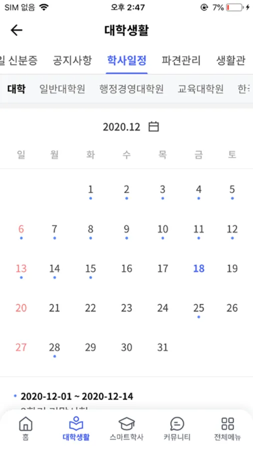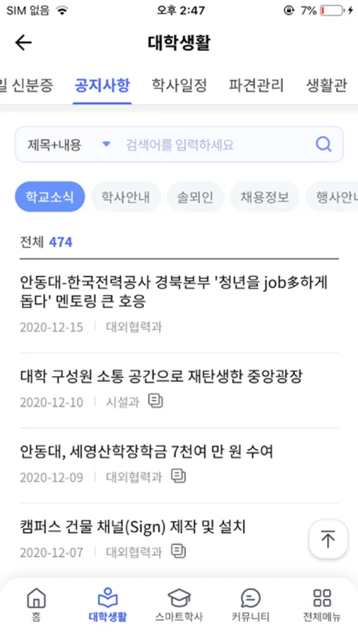 - 교내전화번호, 공지사항, 학사일정, 캠퍼스맵, 학과소개