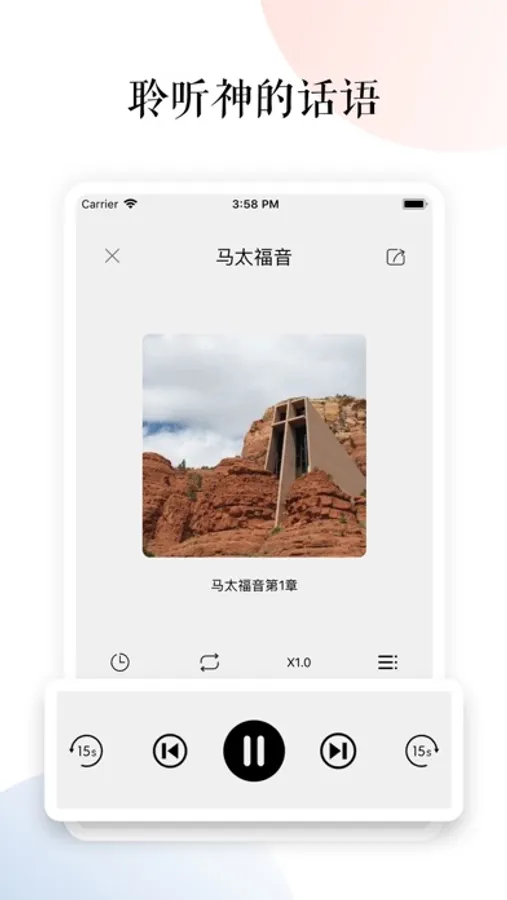 *个性化的播放器设置,可设置播放倍速,循环或单集播放模式以及快进快退设置定时等多种播放设置,让心灵跟着主的圣语享受;