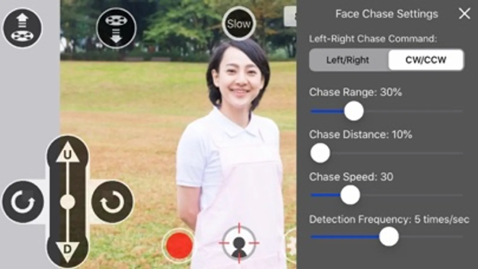 The face chase function automatically controls the back and forth movement based on the first detected face size. In the vertical and horizontal directions, Tello automatically flies back within the range specified by "Face Chase Settng".
