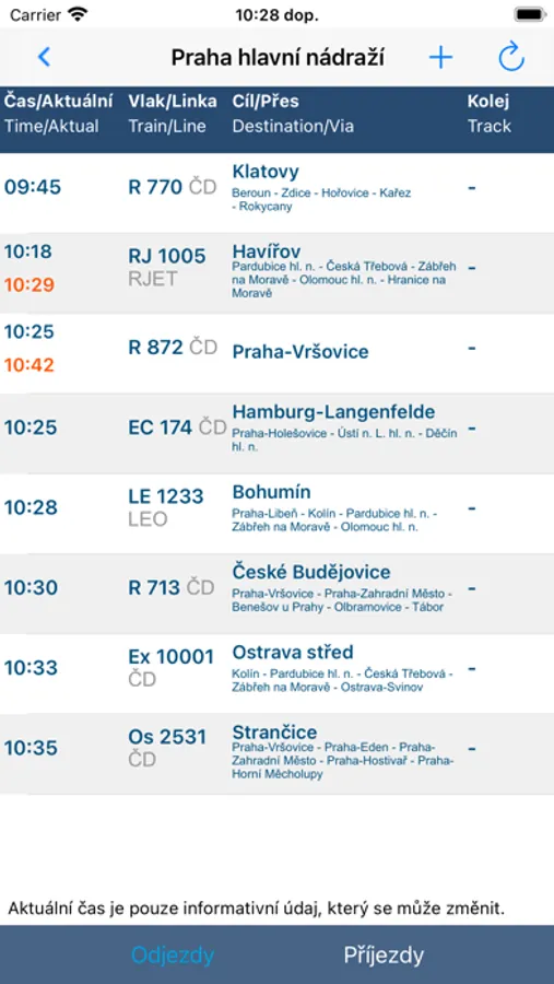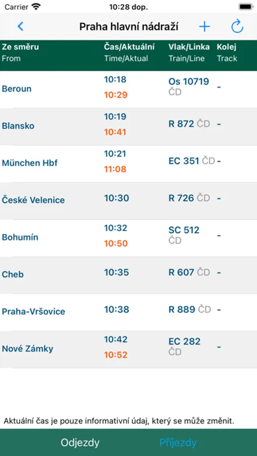- nástupištích, případně kolejích, ze kterých budou jednotlivé vlaky odjíždět.
