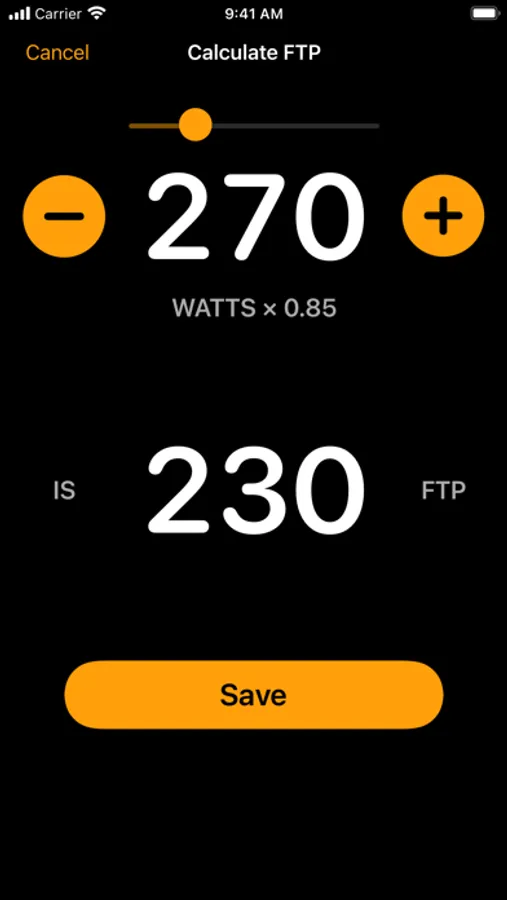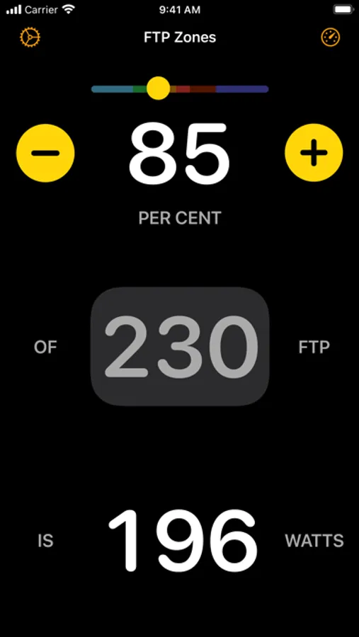 During structured workouts, adjust the percentage and the app shows the target power for that stage. For example, 85% of a 230 Watt FTP is 196 Watts. Use FTP Zones instead of trying do the math in your head!