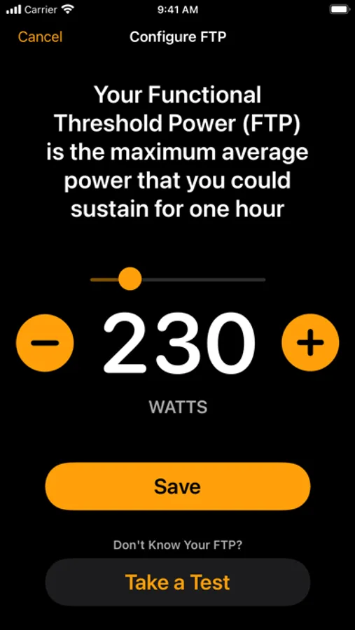 If you don't know your FTP or want to measure improvements over time, use the app to take a 1, 3, 5 or 20 minute test. The app can calculate your FTP from your average power over the test period (your bike must have a display which shows this information). Alternatively, calculate the average power required to achieve a particular FTP test result.