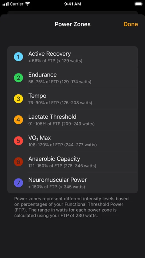 FTP Zones allows you to quickly calculate the power corresponding to a specific percentage of your Functional Threshold Power (FTP). Don't know your FTP? Use the app to take a test.