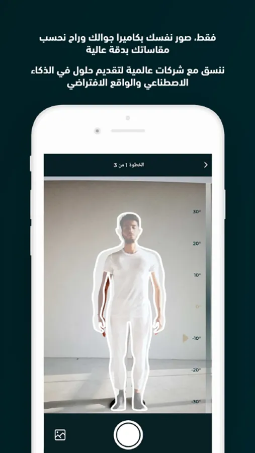 3. صوّر: ما عليك غير إنك تصور نفسك بكاميرا جوالك وراح نحسب مقاساتك بدقة عالية بفضل تقنية الذكاء الاصطناعي والواقع الافتراضي.