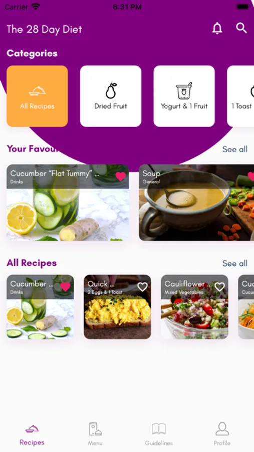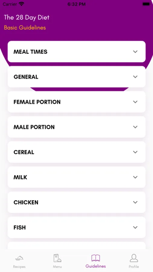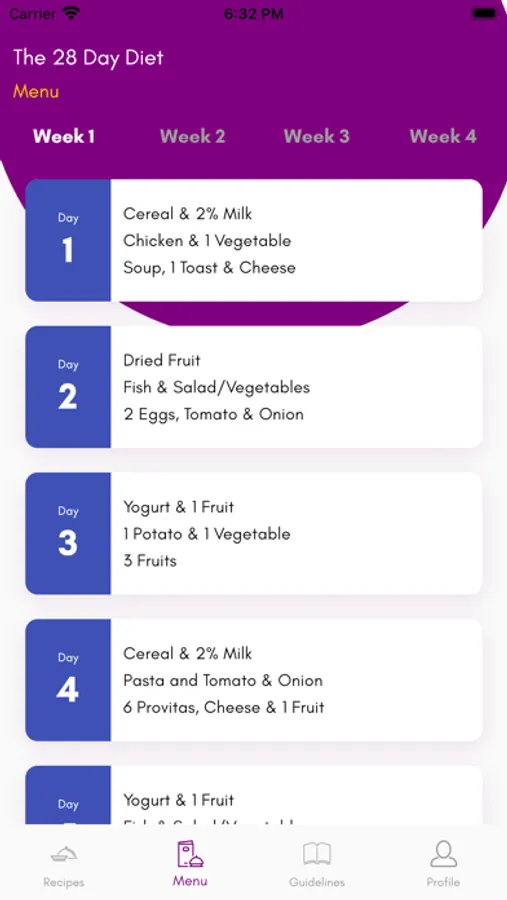 The app also contains a summary of The 28 Day Diet menu from Day 1 to 28, as well as the basic guidelines.