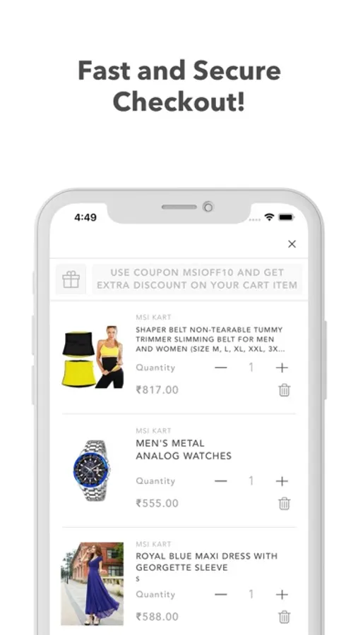 Online shopping with MSI Kart is very easy as you get to shop from the comfort of your home and get products delivered at your doorstep. By downloading the MSI Kart free online shopping app on your phone or tablet, you can effortlessly browse our massive collection & products from multiple categories, fashion wear, electronic devices, videos, accessories and consumer durables. Jewelry, etc...