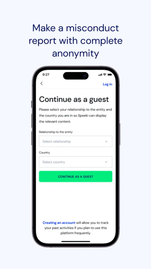 Whether you register or choose to join as a guest, the choice of remaining anonymous is entirely up to you. You have the freedom to connect with various companies using the Speeki platform, offering you a seamless way to report any concerns related to a company's ESG issues – all while preserving your anonymity if so desired.