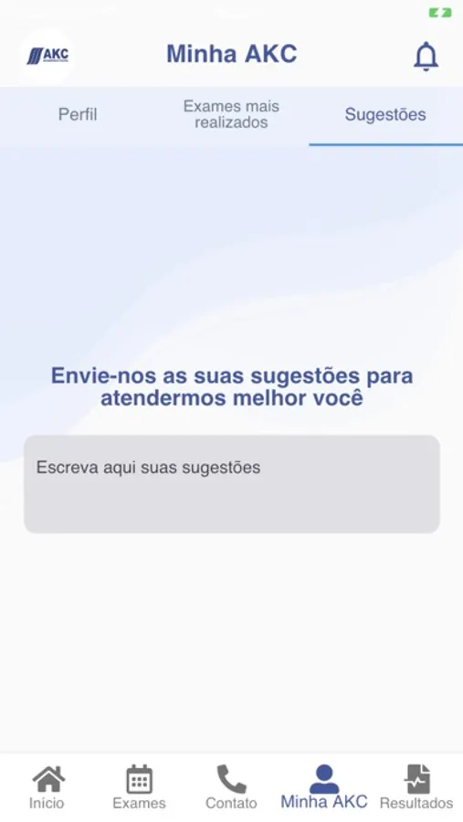 Este é o aplicativo da AKC Diagnósticos. Com ele você tem acesso aos resultados dos seus exames, entre outras informações, de forma rápida e segura facilitando o acompanhamento da sua saúde.