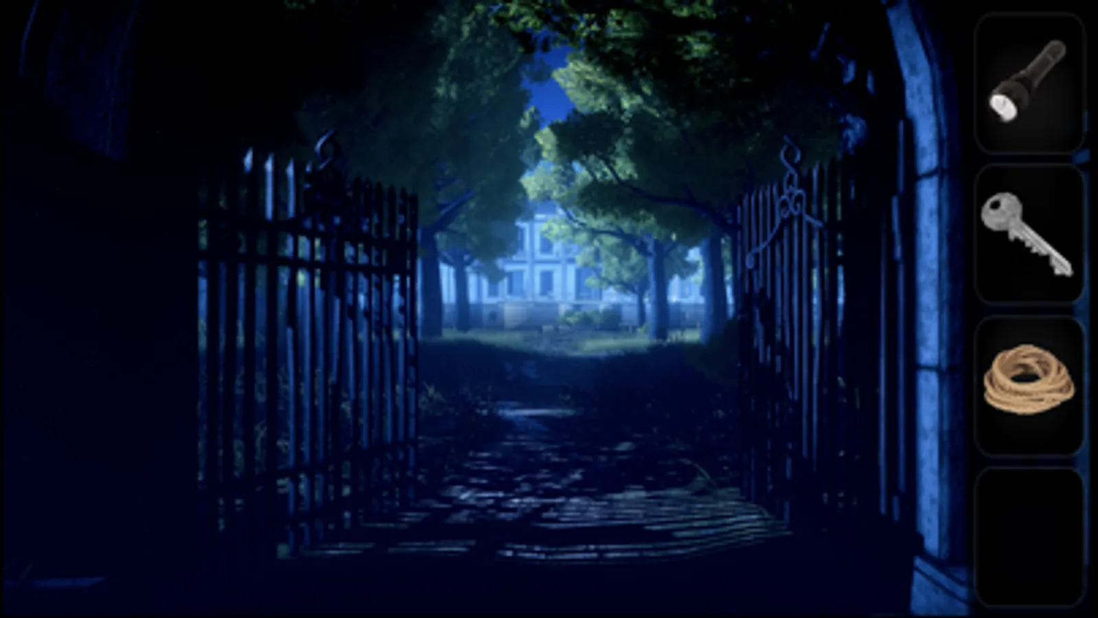 You look around and notice a large mansion house down a gated path. Lights are on so someone must be home. You are thankfully not alone out here.