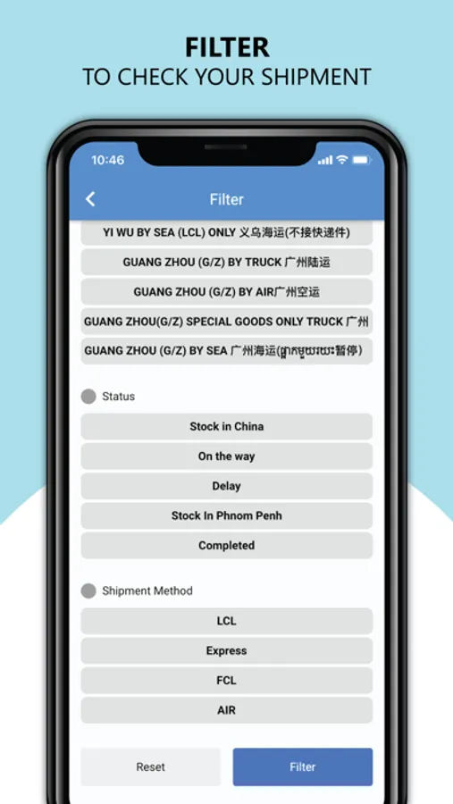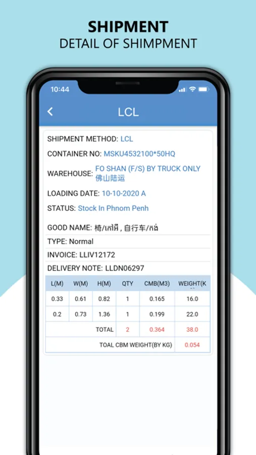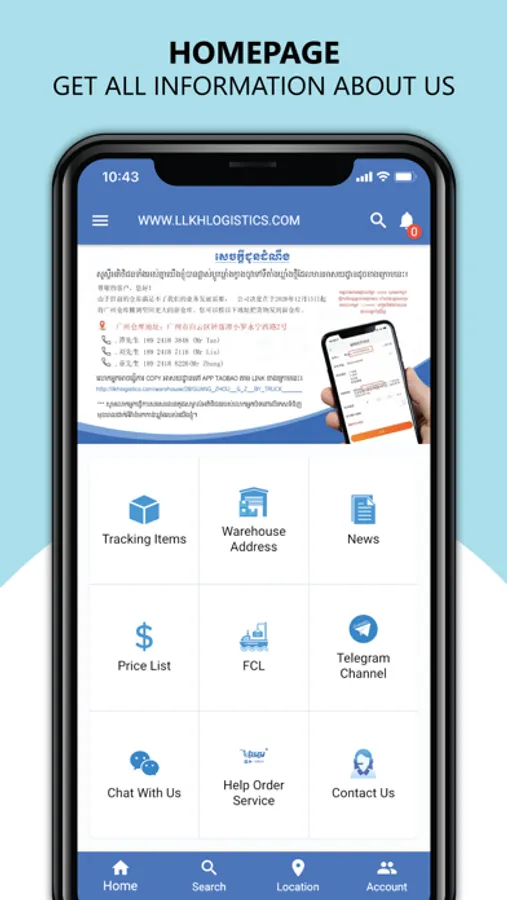 LL Logistics is a leading logistics service in CAMBODIA. LLKHLogistics is a mobile app that allows you to track your shipment and search with a tracking number. You can check all detail of your goods that you shipping such as the number of pieces, CBM, weight, and get on up-to-date on where your shipment is and when it will arrive. You will get all information about price, warehouse address and all notify updates about our service.