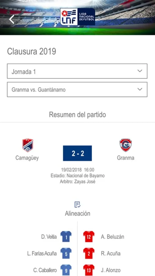 Sigue todas las competiciones de fútbol de Cuba a través de la aplicación oficial de la Asociación de Fútbol de Cuba (AFC). Resultados en tiempo real, videos, perfiles de jugadores, estadísticas individuales por jugador / equipo.