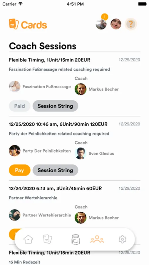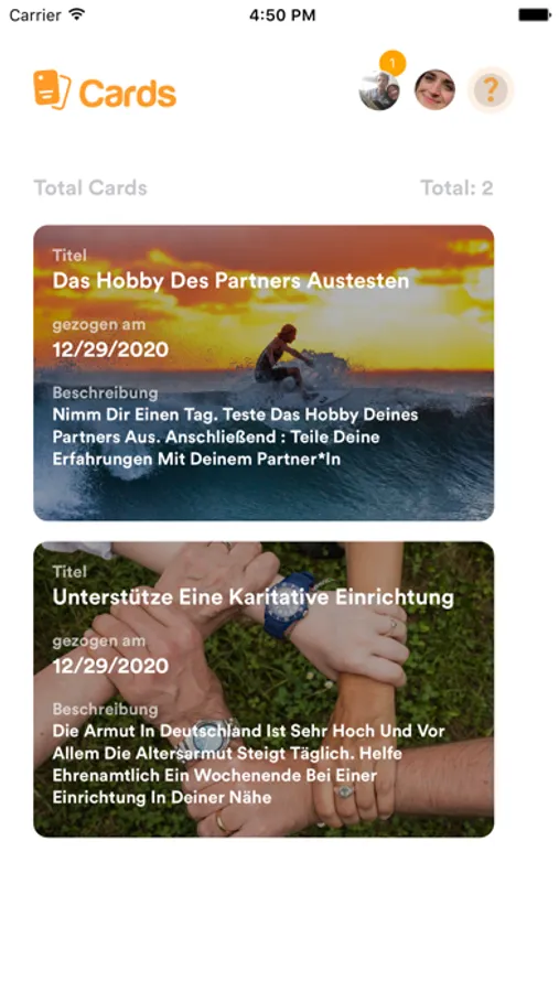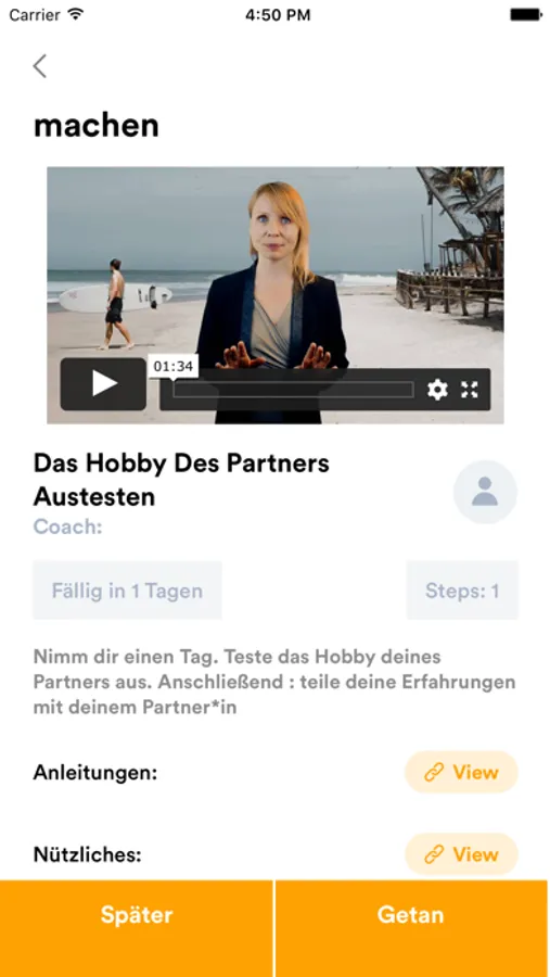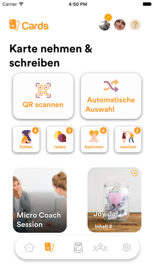 install app and with valid app key ( df-60111 ) of edition "Zeitleben" register yourself as a couple. then either scan QR code of a physical card or let the system choose a card for u by he function automated selection. Read your task = card and start playing. in case u need help, decide whether you book a micro coaching session, a card related help. In case you do, select manual a coach after checking her/hos profile and /or introduction video. Furthermore you have the possibility to write a joy notice with wishes, compliment or requiremrents. You "put" this joy notice in the virtual joy jar. your partner will get a push notification, there a new message is in the common joy jar. Friendly reminders and gently pushes garantuee that you will daily remembered of one of your most valuable thing - your relationship.
