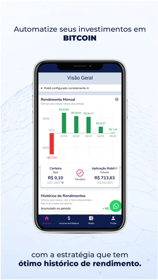 Os trades automáticos são realizados dentro da sua própria carteira da Binance (maior corretora de criptos do mundo), com uma conexão segura e explicada passo-a-passo no aplicativo.