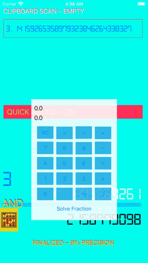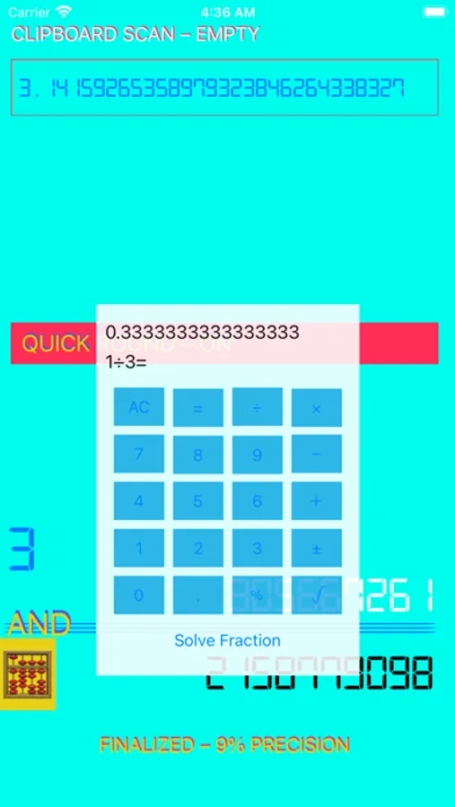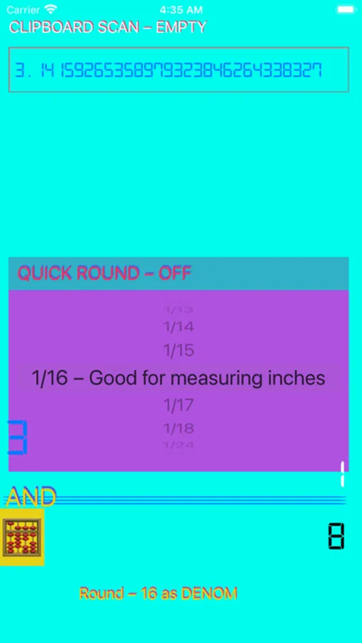 A fraction calculator, that grabs your clipboard and filters it into numbers for example rounding to to the nearest 16TH of an inch. A calculator with an assistant. Custom denominators. With a decent way of solving all decimal numbers into fractions. A fraction calculator that registers up to 38 Decimal points of precision. With a fraction epsilon for averaging up to 1.0E-38 digits of precision. Handles extremely large numbers by converting to scientific notation and rounding up for negative and down for positive. Negative numbers dealt with. Fractions can be more precise now also. This allows for larger numbers to be used.