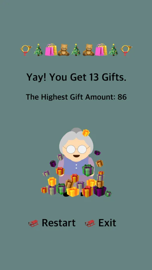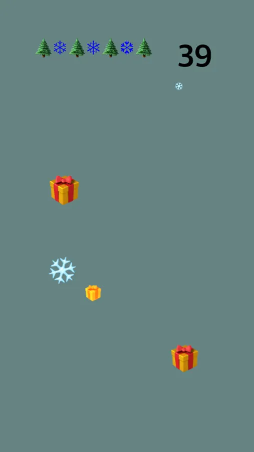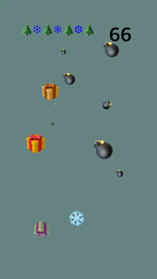 Level 5: After achieving 40 points, bombs will begin appearing on screen in addition to the existing gifts and snowflakes. If the player accidentally taps the bomb, the game ends. Having multiple moving pieces on screen will train our Senior players to increase their focus and agility.