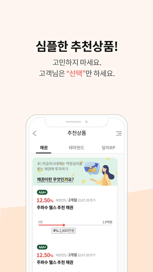 채권, 펀드, 달러RP 같은 금융상품을 쉽고 간편하게 추천해 드립니다.