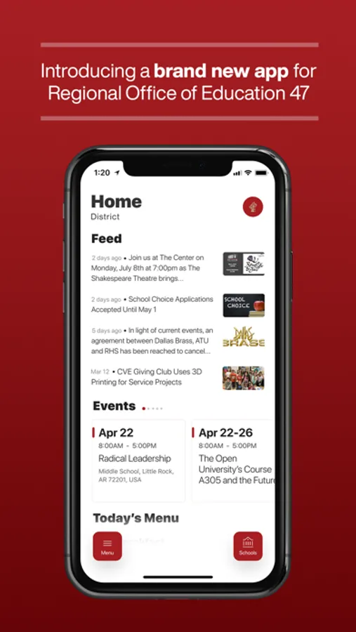 The event section shows a list of events throughout the district. Users can add an event to your calendar to share the event with friends and family with one tap.