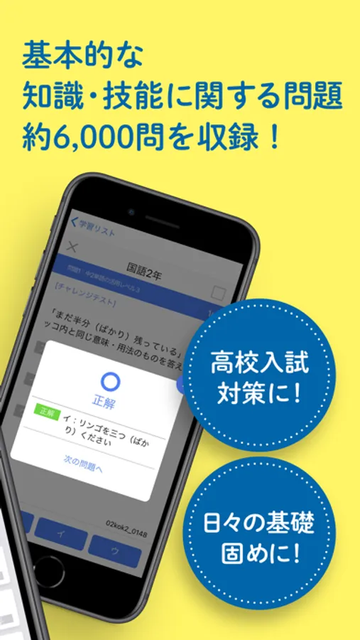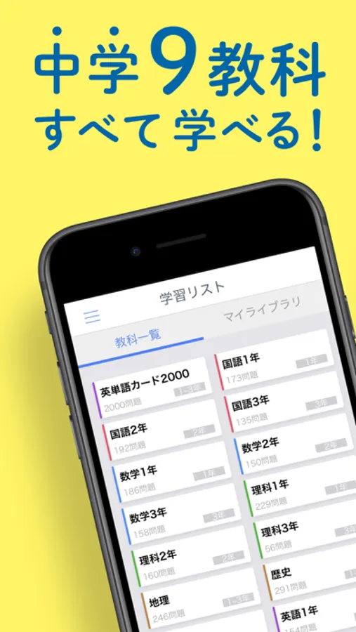中学校で学習する9教科(国語,数学,理科,社会(地理,歴史,公民),英語,保健体育,技術・家庭,美術,音楽)について,基礎的な知識・技能の問題を3択式で手軽に学習できます。隙間時間や毎日短時間の利用で,全教科の基礎知識を身につけることができます。
