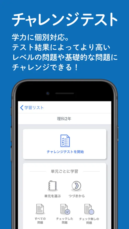 ・「チャレンジテスト」は10問1セットのテストとなっており,テスト結果に応じて,より難しいテストに挑戦したり,易しいテストで基礎固めをやり直したりすることができます。