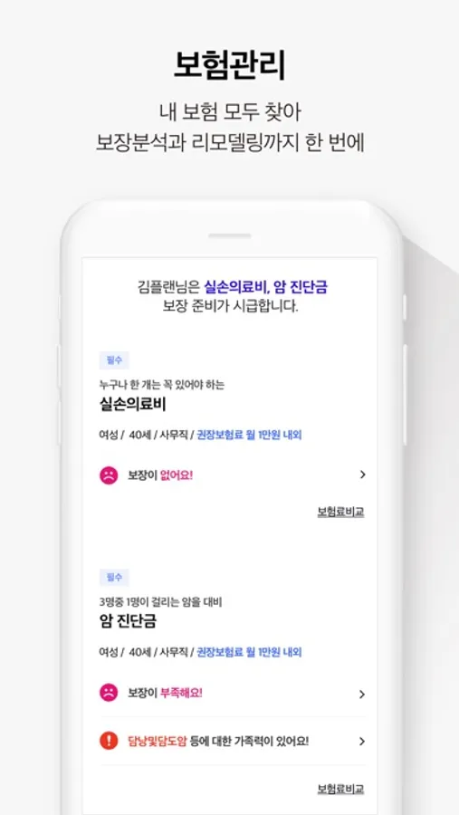 · 나에게 필요한 보장이 잘 준비되어 있는지 점검하고, 추가적으로 보완해야 하는 보험을 알려드려요.