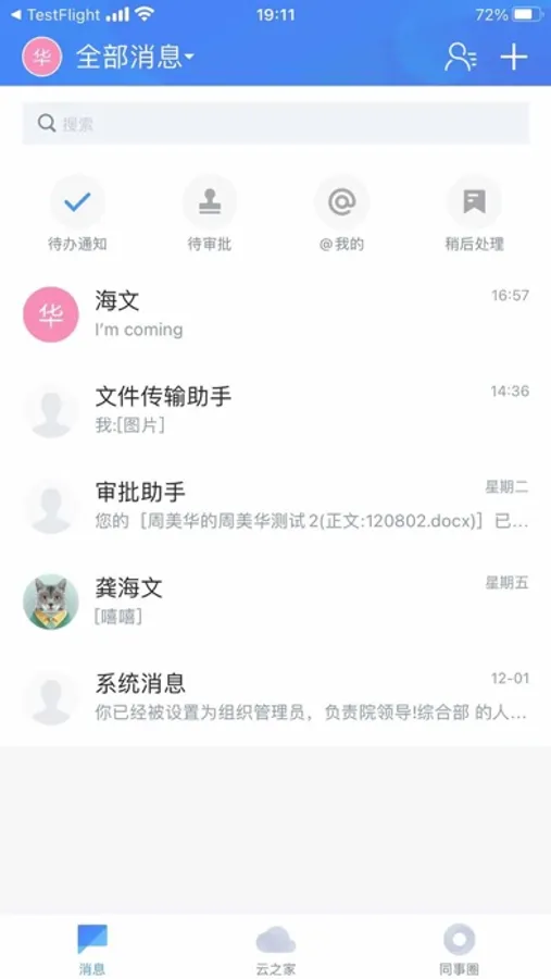IM沟通:快速连接企业内部员工,一键发起基于企业通讯录的跨组织消息沟通,已读未读,消息提醒等高效便捷;