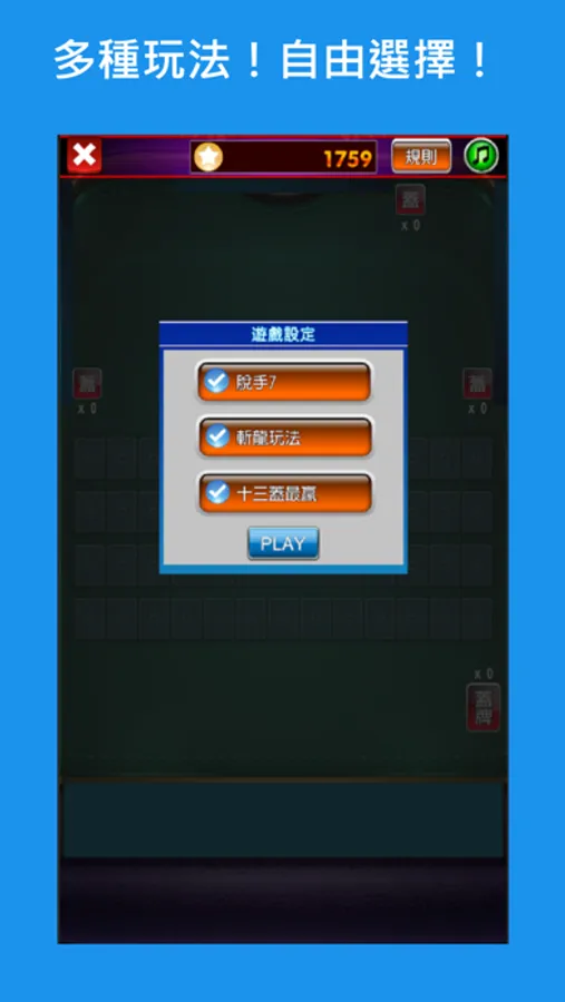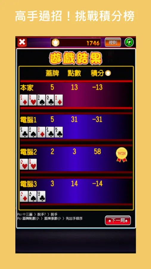 十三蓋 〉脫手7 〉脫手 〉蓋牌點數小 〉蓋牌張數小 〉先出手順序