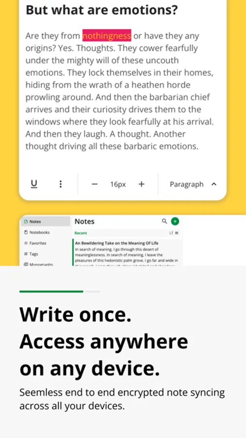Sync notes in a safe and secure way. All your notes are encrypted on your device and synced so no matter what device you use, you always have access to what you write and journal in notepad.