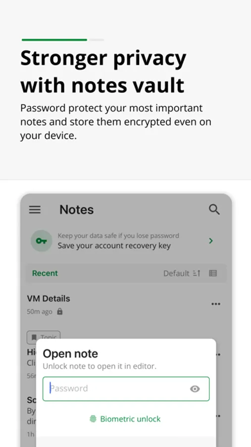 Double encrypt your notes with vault. Locked notes require password on open and are encrypted at rest.