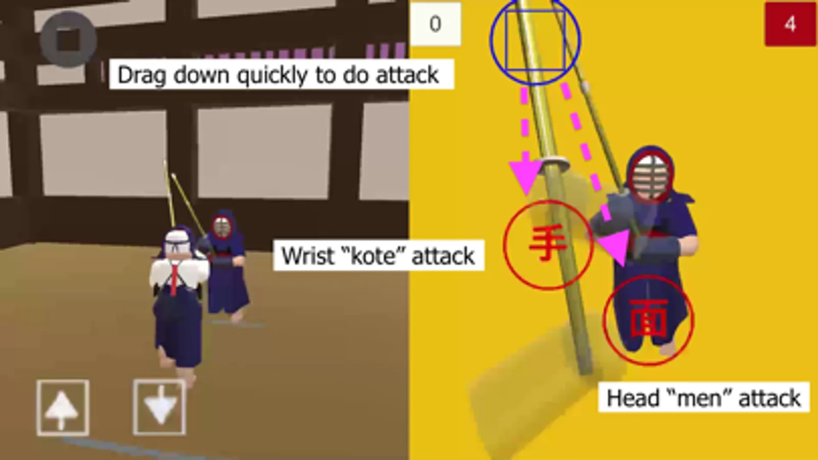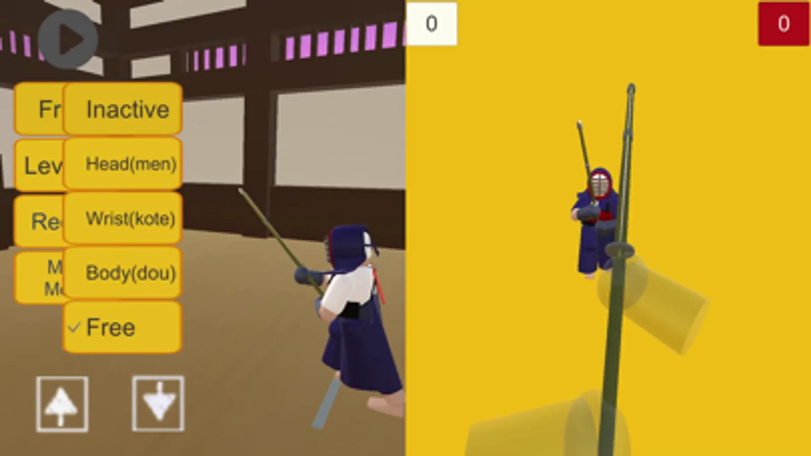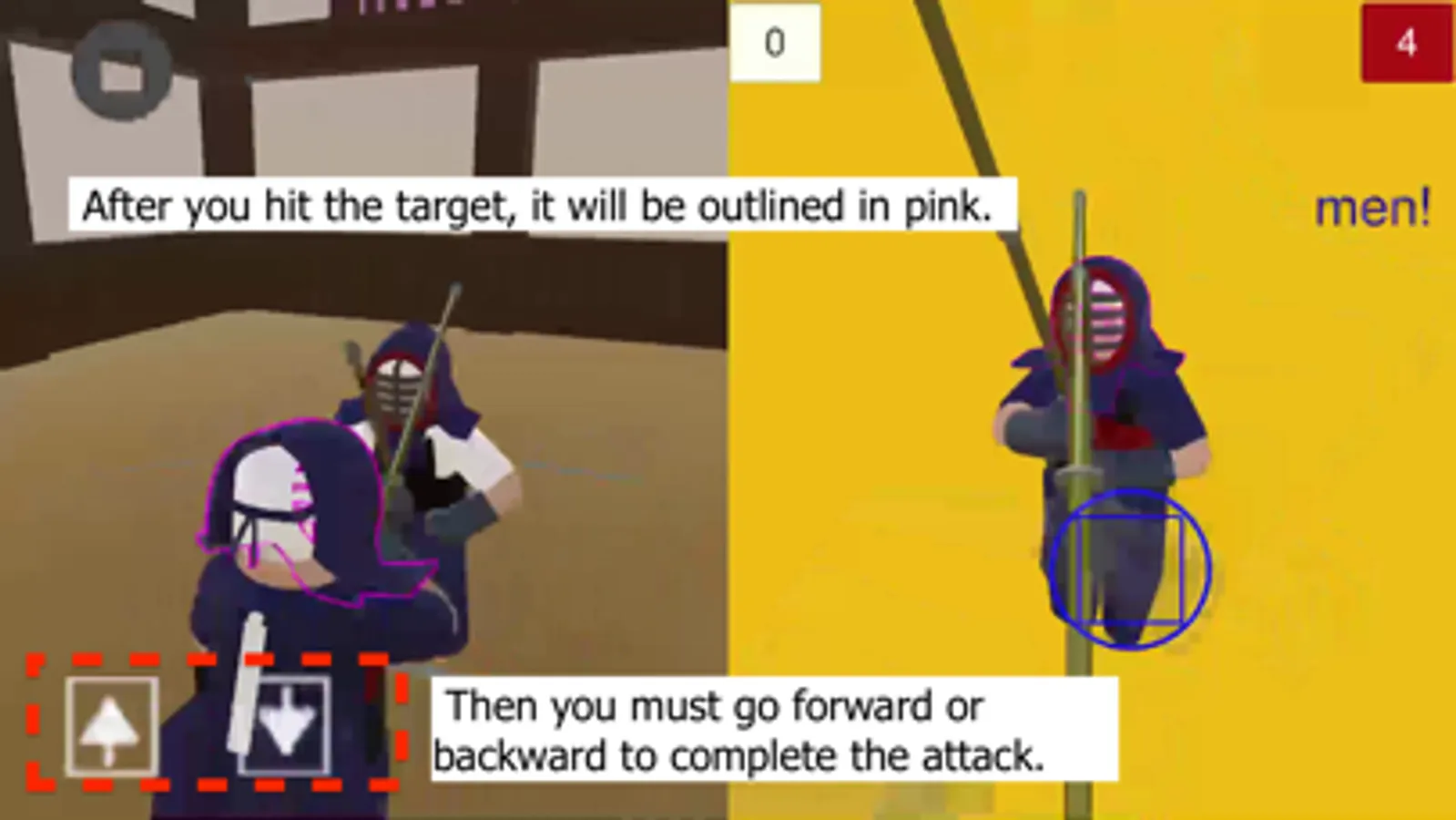 The 1-player room allows you to fight against the computer (you can change the level and the types of attacks that they use). Pressing and dragging on the point of view screen will cause your sword (shinai) to rise and you can move it to defend yourself. Raising it above your head will reveal target buttons for doing different attacks. To do the attack, you need to drag down quickly to the target button and your attack will be initiated. The “men” head button is in the center, and there is a “kote” button for each wrist. The “dou” body button is revealed when your finger is in the top left or top right part of the screen. If you hit the target with sufficient force, you will see its outline light up and you will hear your "kiai" scream. When that happens, you need to either move forward into (or backwards away from) your opponent to complete your attack and a win ("ippon") has been registered. When you win, the judges raise a flag that corresponds to the small piece of cloth on the back of your player ("tasuki").