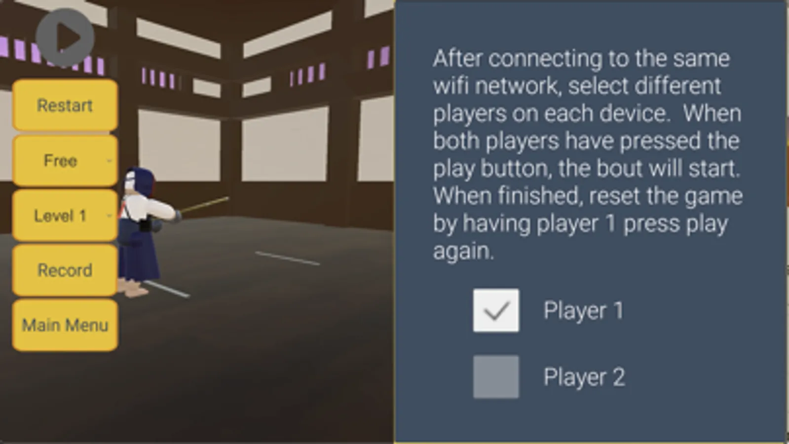 In the 2-player room, you can play against your friends. First connect both machines to the same wifi. Then one player selects player 1 and the other player selects player 2. Then both players should press the Bow button at the top left of the screen to start. The players will bow together and then once they are up, you can start. At the end of the match, player 1 can press the play button to reset the players on both machines. Then both players must press the Bow button to start the match.