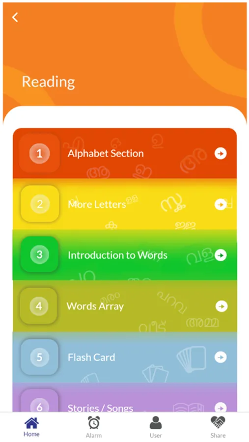 Reading Section with levels beginning from Alphabet and then words, Flashcards (Printable), stories and Rhymes