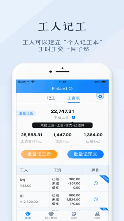 『工人记工』工人可以建立“个人记工本”,工时工资一目了然