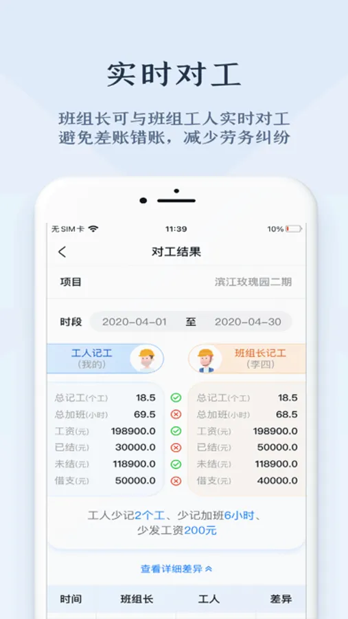 『实时对工』班组长可与班组工人实时对工,避免差账错账,减少劳务纠纷