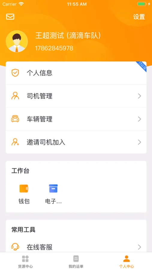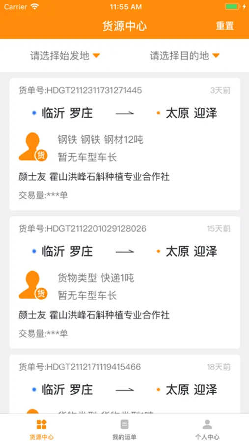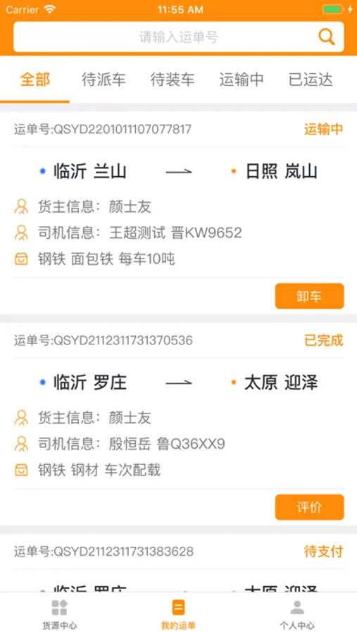 司机APP面向司机/车队使用,设计有货运中心、我的运单和个人中心等功能模块。实际承运人通过司机端APP可完成用户注册认证、接单、咨询投诉、服务评价、电子运单、电子合同等功能操作,用户通过司机端APP可完成全部货主业务操作。