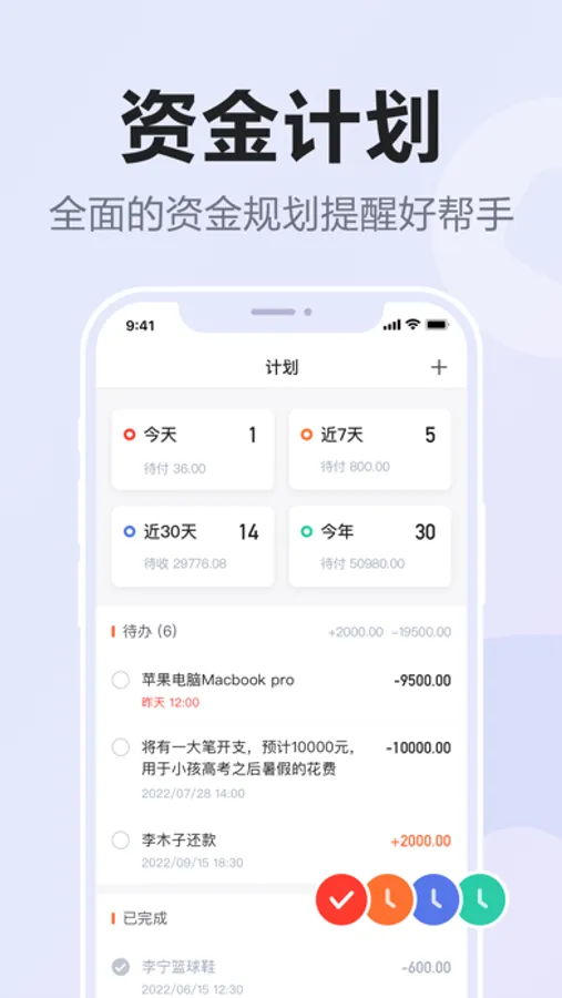 -计划管理:录入未来计划开支,资金全面规划,及时提醒,重要款项不怕错过