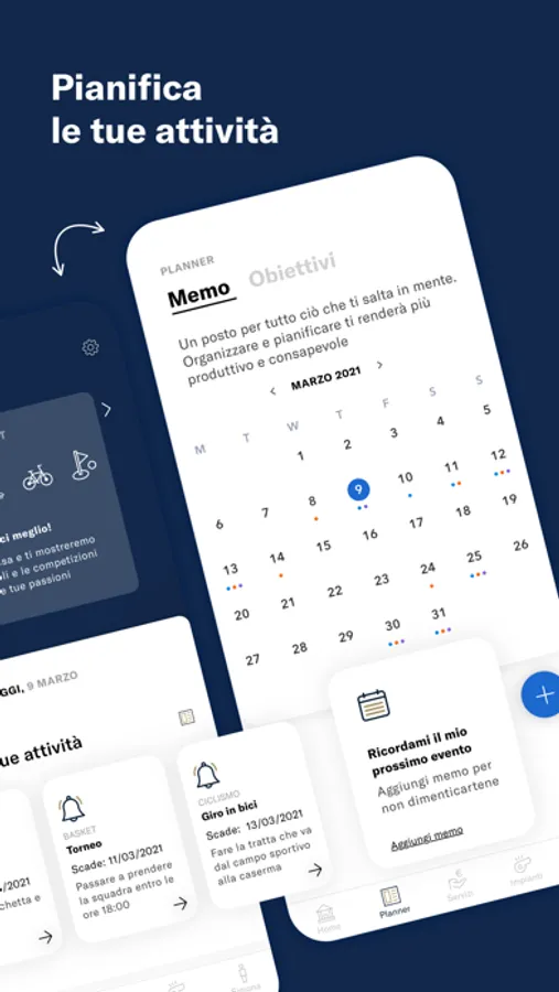 -Semplificare l’organizzazione delle tue attività sportive. Avrai la gestione diretta degli appuntamenti e del calendario dei tuoi impegni e la possibilità di pubblicare eventi e news all’interno dell’app per tenere aggiornati gli sportivi come te.