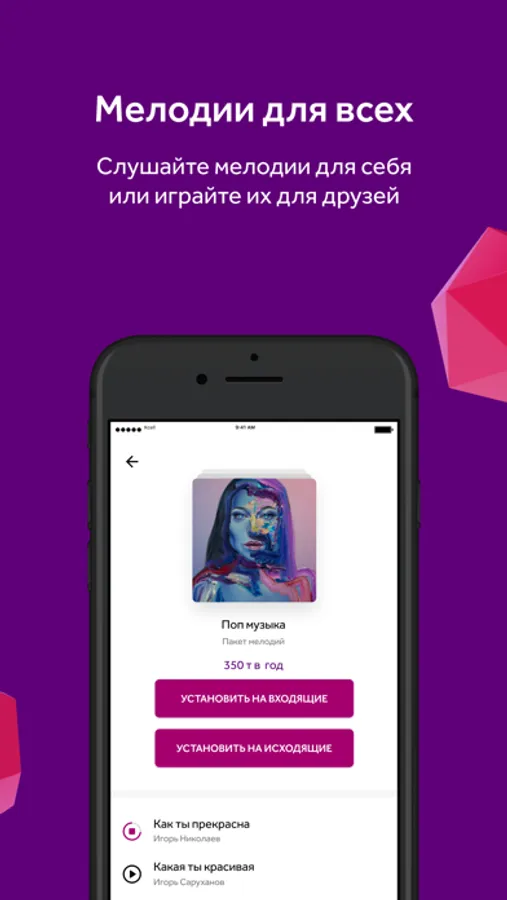 При заказе мелодий из приложения услуга Simfonia и/или Моя Simfonia подключается автоматически (если она не была подключена ранее). После установки мелодии гудки в вашем телефоне меняются на новую мелодию, которую будут слышать все звонящие Вам абоненты.