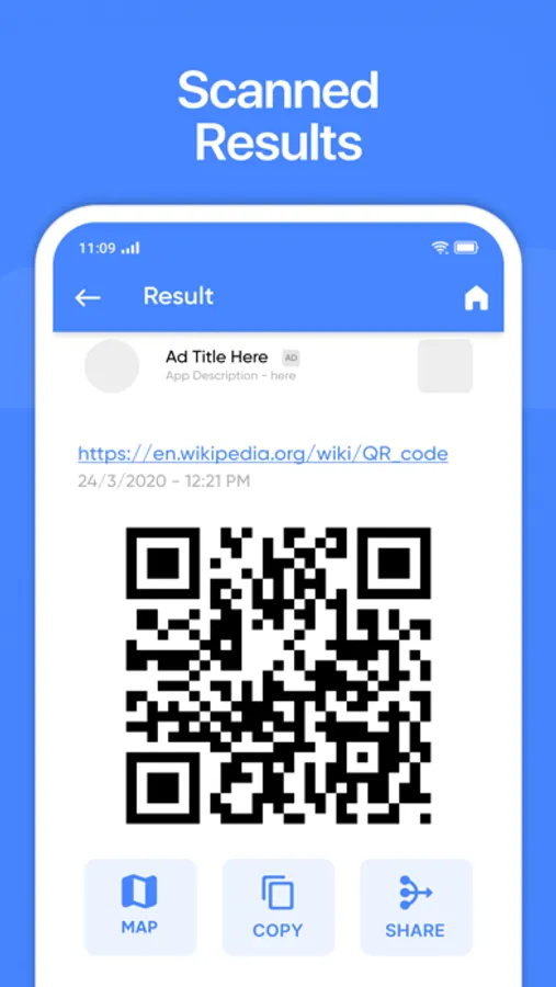QR Scanner & Barcode Reader _ QR code Generator uses the smart phone camera to scan the QR code, and while scanning the QR code if the codes contains a URL of a website the user can copy, open and share the website link by just pressing one button.