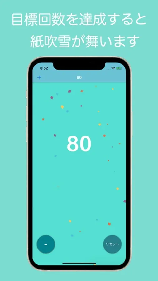 また、目標回数を設定することができ、設定した目標回数に到達すると紙吹雪のアニメーションが現れます。