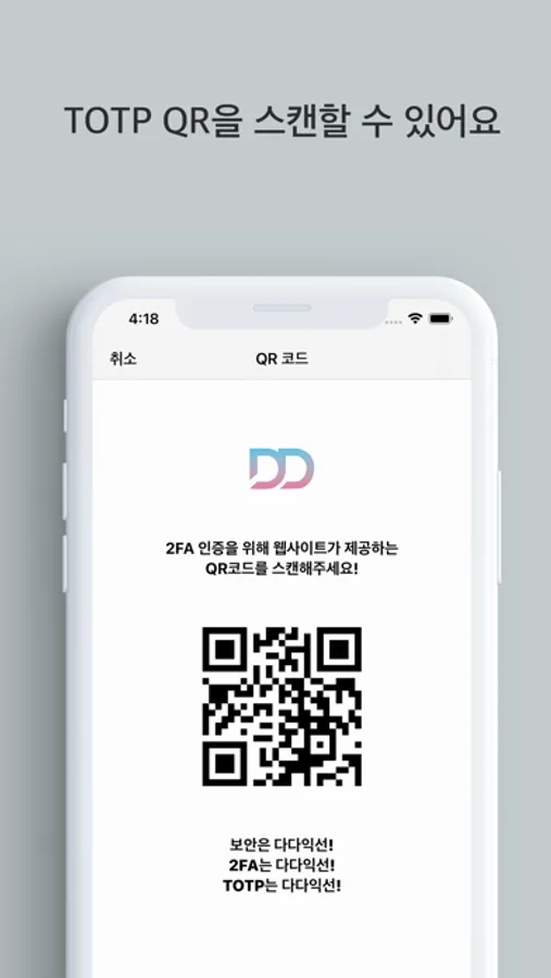 - 2FA 이중 인증을 위한 TOTP 토큰을 QR 코드 스캔을 통해 편리하게 등록할 수 있습니다.