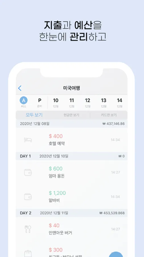 > 여행 중 발생한 지출과 추가되는 예산 내역들을 빠르고 간단히 입력하고, 경비 리포트로 지출 내역을 확인해보세요!